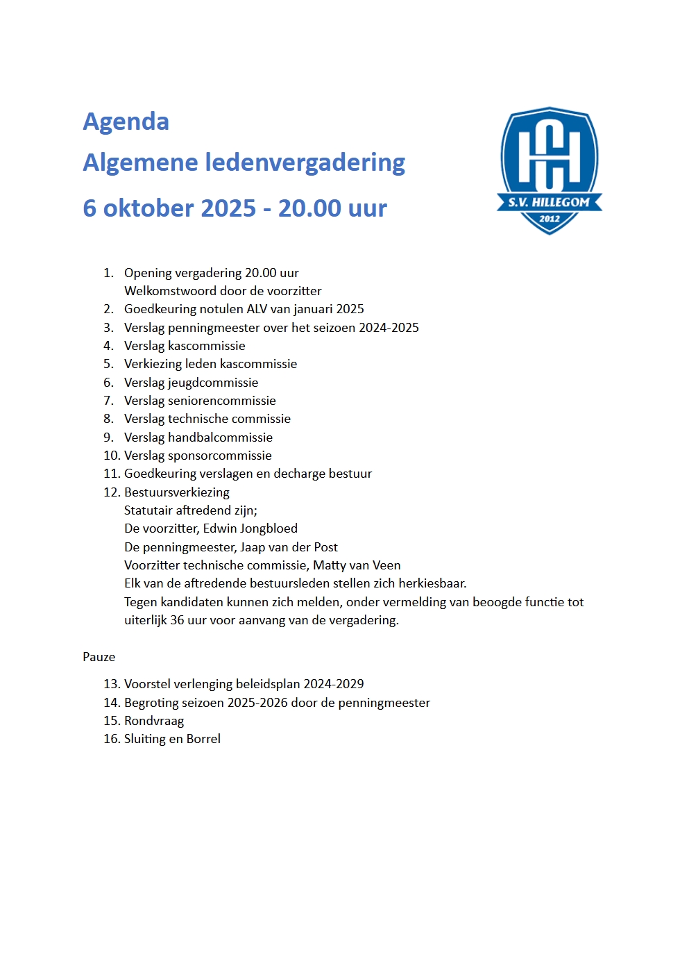 Het bestuur van SV Hillegom nodigt u van harte uit voor de Algemene Ledenvergadering op: