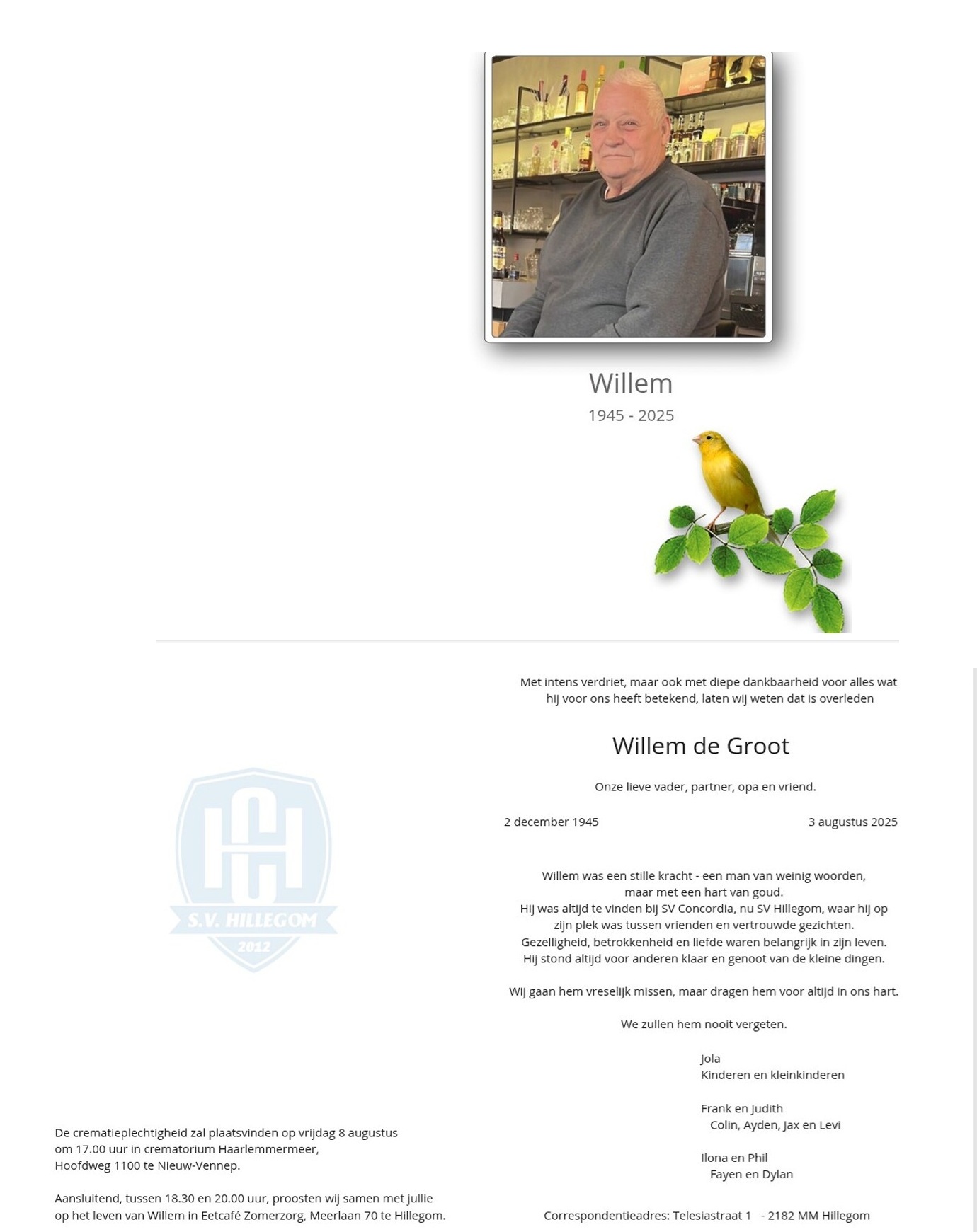 Vandaag zondag 3 augustus is Wim (Willem voor vrienden en bekenden) de Groot overleden.